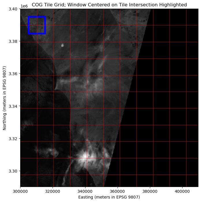 # Define the region spanning multiple tilesintersection_xmin = bounds.left + tile_width *0.5intersection_xmax = bounds.left + tile_width *1.5intersection_ymax = bounds.top - tile_height *0.5intersection_ymin = bounds.top - tile_height *1.5# Plot the raster with the gridfig, ax = plt.subplots(figsize=(10, 8))ax.imshow(overview, cmap="gray", extent=[bounds.left, bounds.right, bounds.bottom, bounds.top])ax.set_title("COG Tile Grid; Window Centered on Tile Intersection Highlighted")ax.set_xlabel("Easting (meters in EPSG 9807)")ax.set_ylabel("Northing (meters in EPSG 9807)")# Add grid linesfor x in x_coords: ax.axvline(x=x, color="red", linewidth=0.5)for y in y_coords: ax.axhline(y=y, color="red", linewidth=0.5)# Highlight the read arearead_area = Rectangle( (intersection_xmin, intersection_ymin), intersection_xmax - intersection_xmin, intersection_ymax - intersection_ymin, linewidth=4, edgecolor="blue", facecolor="none",)ax.add_patch(read_area)plt.show()