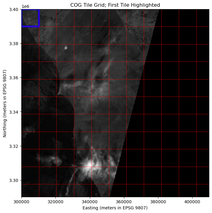fig, ax = plt.subplots(figsize=(10, 8))ax.imshow(overview, cmap="gray", extent=[bounds.left, bounds.right, bounds.bottom, bounds.top])ax.set_title("COG Tile Grid; First Tile Highlighted")ax.set_xlabel("Easting (meters in EPSG 9807)")ax.set_ylabel("Northing (meters in EPSG 9807)")# Add grid linesfor x in x_coords: ax.axvline(x=x, color="red", linewidth=0.5)for y in y_coords: ax.axhline(y=y, color="red", linewidth=0.5)# Highlight the first tile (top-left)first_tile_xmin = bounds.leftfirst_tile_xmax = bounds.left + tile_widthfirst_tile_ymax = bounds.topfirst_tile_ymin = bounds.top - tile_heightrect = Rectangle( (first_tile_xmin, first_tile_ymin), tile_width, tile_height, linewidth=4, edgecolor="blue", facecolor="none",)ax.add_patch(rect)plt.show()